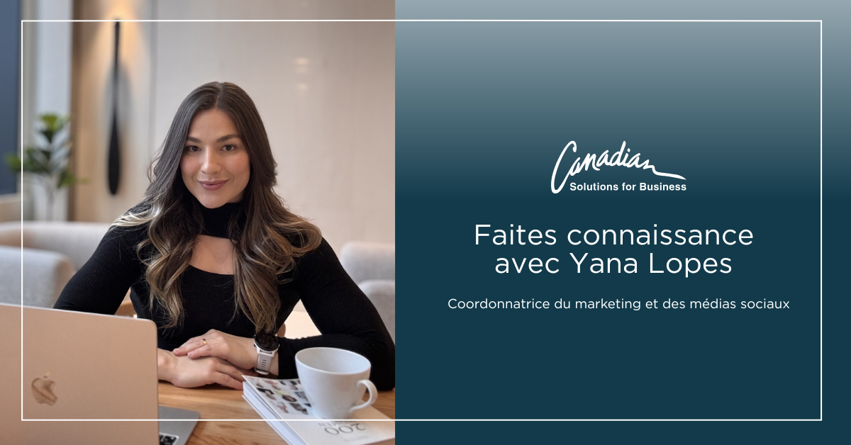 Nous sommes ravis de présenter Yana Lopes, coordonnatrice du marketing et des médias sociaux chez Canadian Solutions for Business. Yana joue un rôle clé dans la manière dont CSB interagit avec sa communauté, qu’il s’agisse des fournisseurs partenaires, des représentants commerciaux ou de tous les clients partout au Canada.